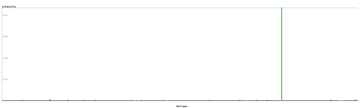 At the top of the view, the position of the antigen (identified by the corresponding HPA identifier) is shown as a green bar. A yellow triangle on the bar indicates a <100% sequence identity to the protein target.