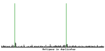 At the top of the view, the position of the antigen (identified by the corresponding HPA identifier) is shown as a green bar. A yellow triangle on the bar indicates a <100% sequence identity to the protein target.