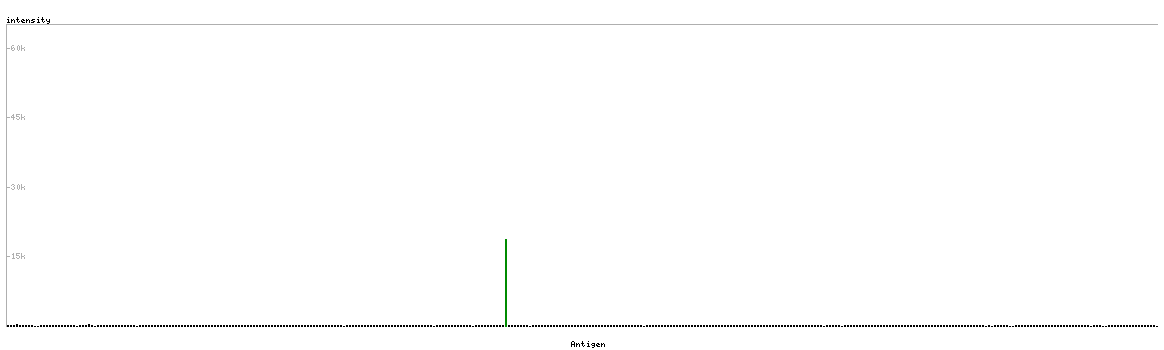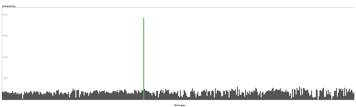 At the top of the view, the position of the antigen (identified by the corresponding HPA identifier) is shown as a green bar. A yellow triangle on the bar indicates a <100% sequence identity to the protein target.