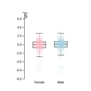 Blood protein levels in 96 healthy adults (aged 50–65) measured at six visits over a two-year period, shown separately for males and females. Relative protein abundances were quantified using the proximity extension assay (PEA) with the Olink Explore HT.