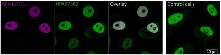 Validation of antibodies using GFP-tagged targetVersion 14 of The Human Protein Atlas includes a new type of validation of antibodies that are used for determining the subcellular localization of a protein. A set of antibodies have been analyzed in transgenic cell lines expressing GFP-tagged target protein at near-endogenous levels to confirm that the antibodies are capable of binding the target protein. The approved antibodies are then used to determine the subcellular localization of endogenous protein in a selection of cell lines. A high validation score is assigned to those genes where the same location(s) are observed for both tagged protein and protein detected using labelled antibody in non-transfected cells. With this approach the subcellular localization can be determined with high certainty. This approach has been used for BOD1L1, a gene with no data on the subcellular location in UniProt. The antibody overlapped with tagged protein in transgenic cells and a nucleoplasmic location was observed with both methods. The Human Protein Atlas currently contains GFP validation data for 100 genes and 123 antibodies. Access all the antibody and antigen data for BOD1L1 here. Also read our blog post on Increasing reliability by co-localization. |