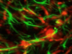 The close interaction between astrocytes (green) and endothelial cells (red) within the neurovascular unit.